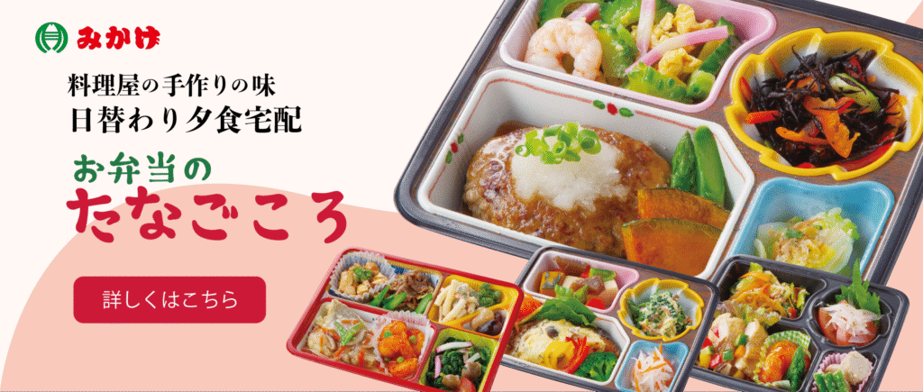 身体に障害をお持ちのお年寄りとその方を介護するご家族の、毎日の食事の準備は大きな負担です。特に一人暮らしの方が、自立した生活を送るためには毎日の食事の支援が不可欠です。 私たちは、栄養士による適正な栄養の提供により疾病を予防し、病状の悪化を防ぐとともに、熟練の調理師による調理で味わい深い料理を提供しています。